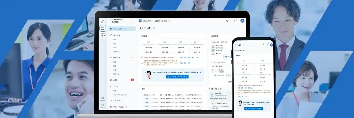 最小の手間で、最大の反響を。物件登録・反響管理・物件チラシ作成などを一元化できる業務支援システムです。AI・自動アドバイス機能搭載。